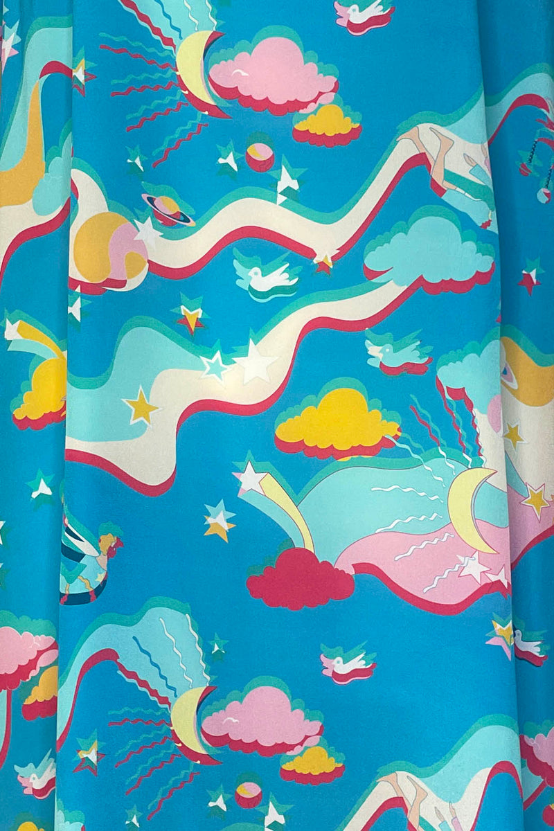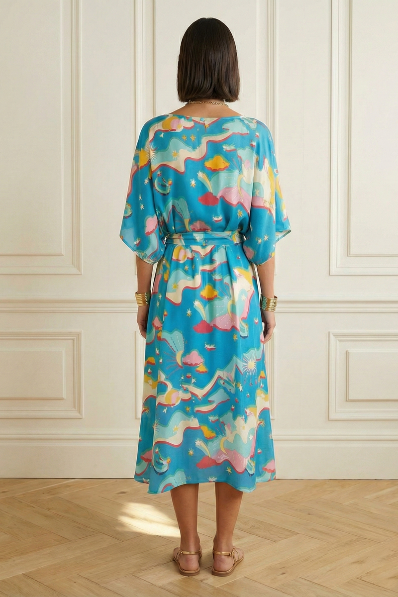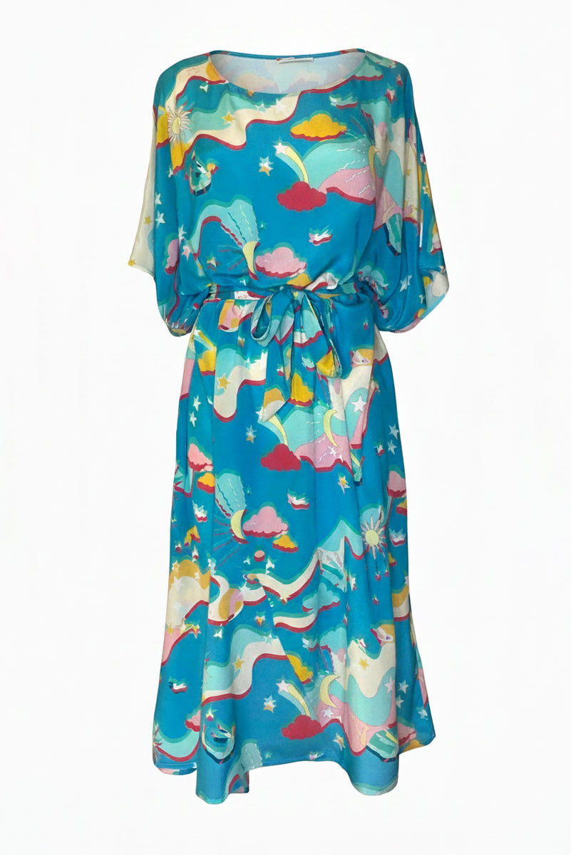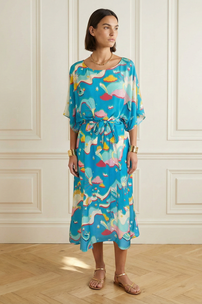 The bespoke print draws direct inspiration from the song "Walking in Space," featuring a kaleidoscope of celestial motifs and vivid hues that mimic a journey through the stars. Whether you are lounging poolside or stepping out for a sunset dinner, the fluid drape of the silk moves with you. Wear it loose for a breezy, bohemian cover-up, or use the removable belt to cinch the waist, instantly transforming it into a sophisticated dress that captures the groovy, uninhibited spirit of the 1960s.
