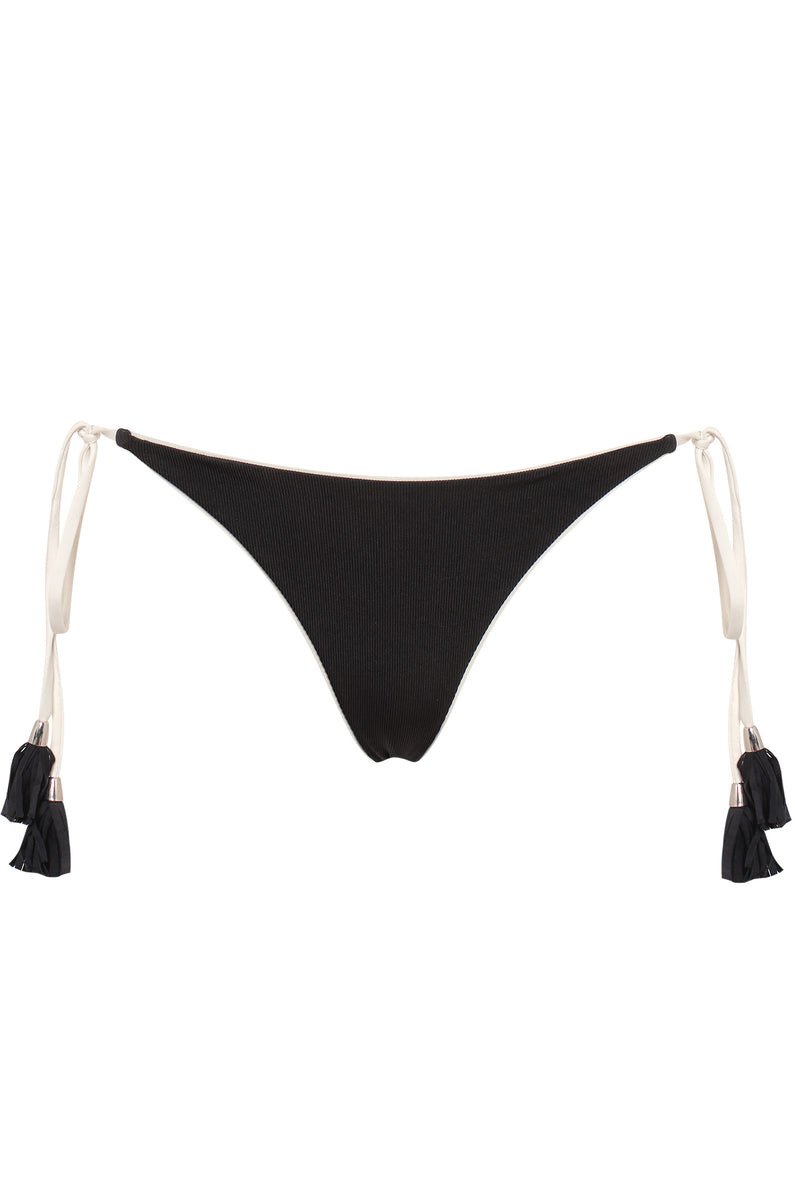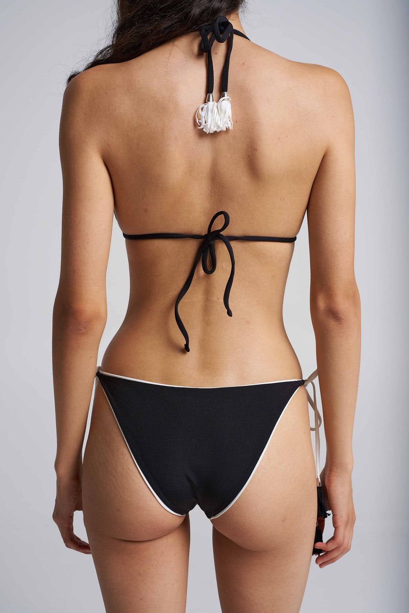 The Nora tie-side bottom in black offers a flattering medium coverage fit, finished with crisp white piping details. Crafted from premium Italian lycra, it features adjustable ties with hand-made tassels for a custom feel. Size up for more coverage, or size down for a more minimal look.