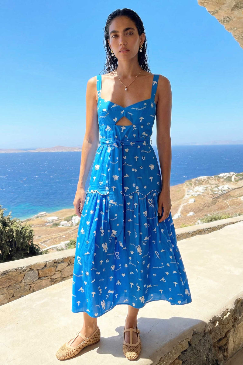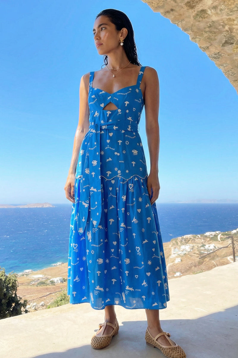 An eye-catching mid-length gown featuring an elegant heart-shaped neckline, delicate front opening, and flowing layered skirt that creates beautiful movement. The Blue Lobster Emma Dress includes a removable waist belt to enhance your figure, making it the perfect versatile piece for seamless transitions from daytime events to evening occasions.