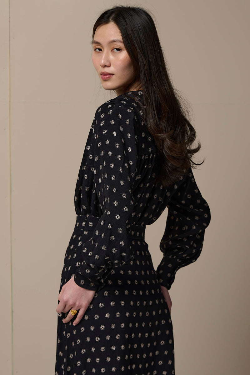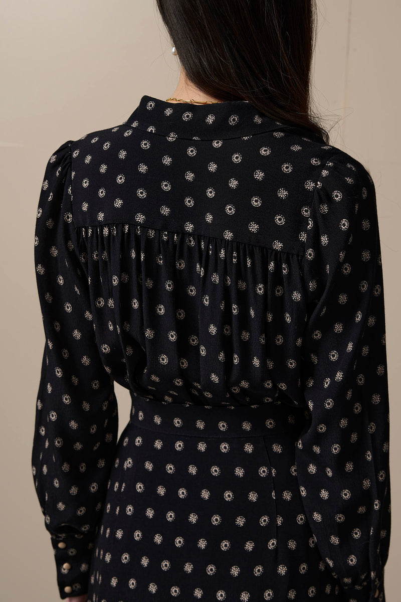 ABOUT THE PRINT: The Borgia Print draws inspiration from Renaissance opulence, featuring a striking polka dot design with champagne-coloured coins set against a deep black background. These coins are a nod to the grandeur of Renaissance Italy, a period of wealth, power, and artistic flourish.