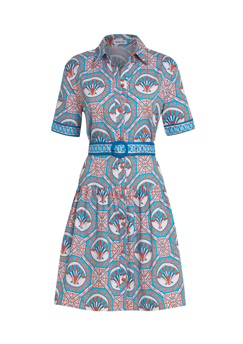 The Ceramica Carla dress is crafted from a linen cotton blend, combining the cool texture of linen with the softness of cotton. Cut to sit above the knee, it’s framed with a contrast print at the belt and sleeves for a graphic finish. The print is hand-drawn in London, and the dress fastens with custom Spanish buttons, adding a considered, artisanal touch.
