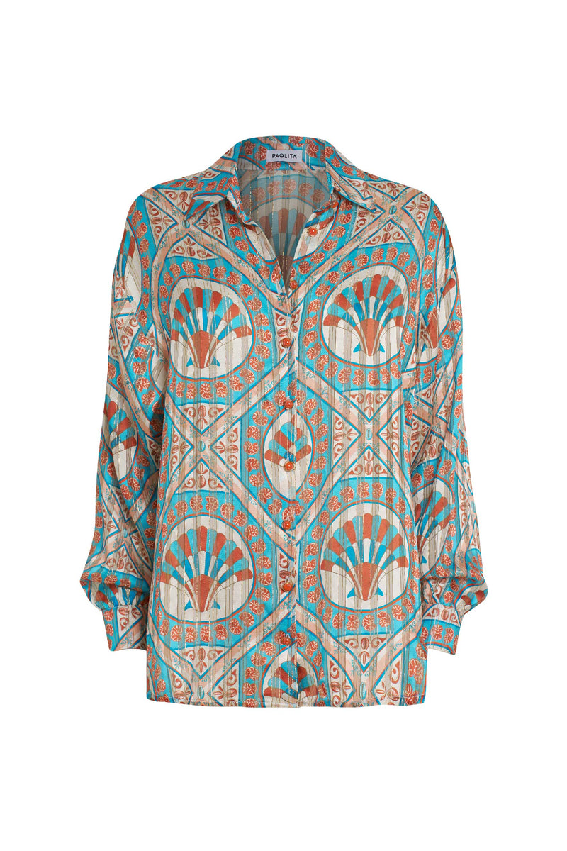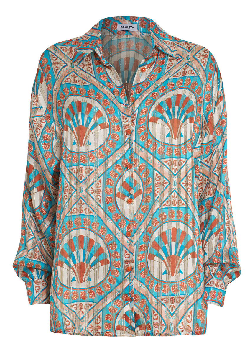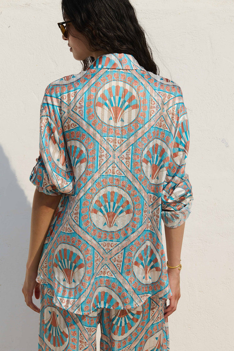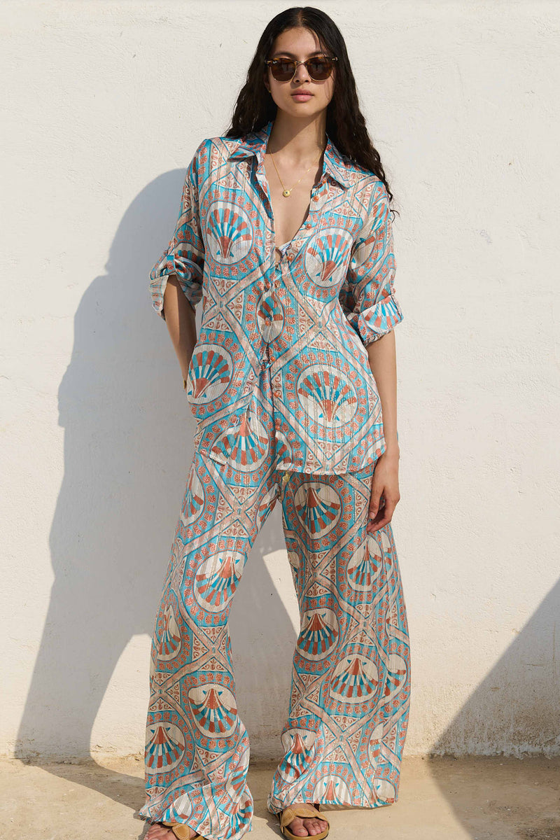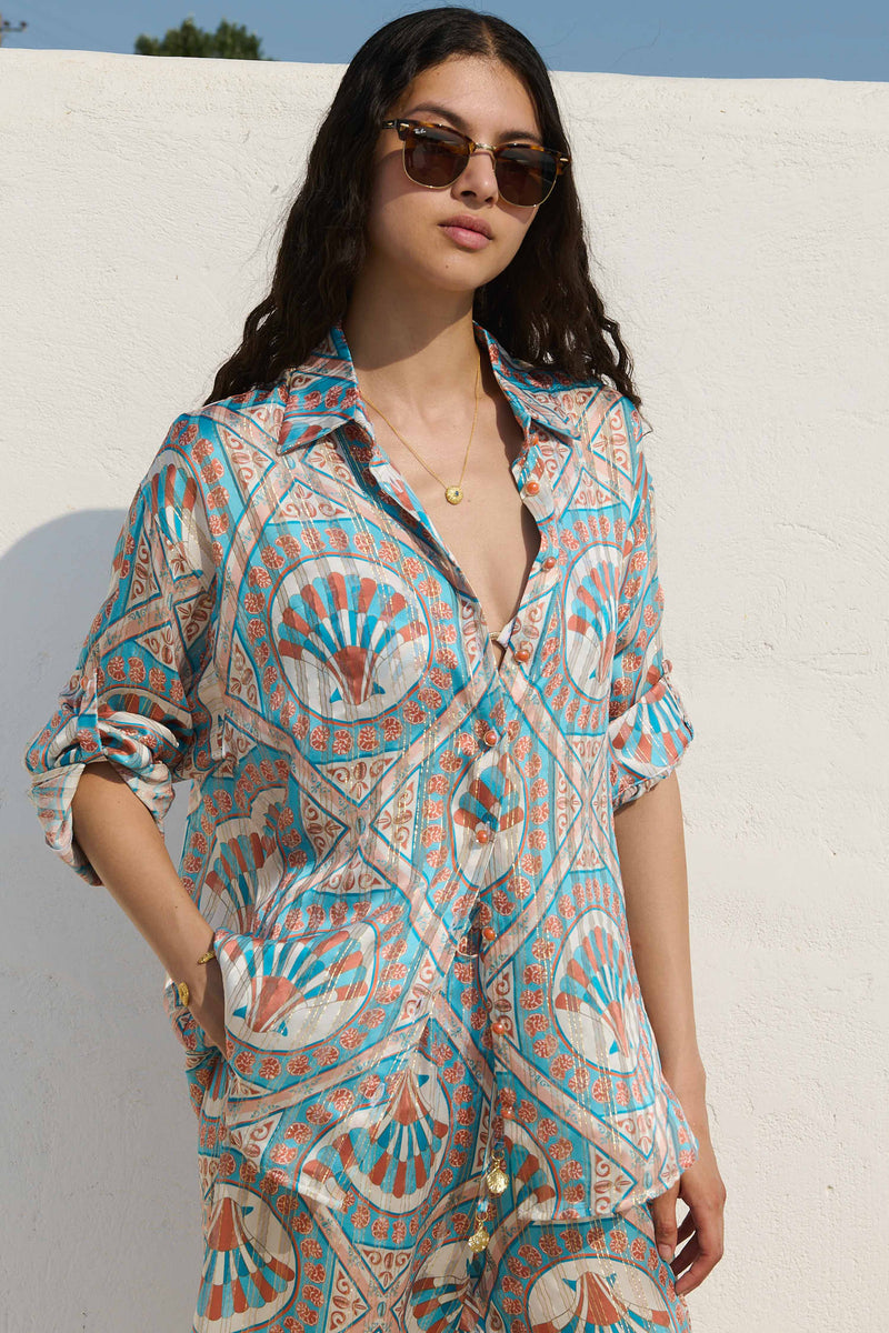 The Ceramica Helena shirt is crafted from luxurious silk with delicate lurex threaded throughout, offering a subtle shimmer and fluid drape. Cut as an oversized silhouette, it works effortlessly as a swim cover-up or styled more polished, tucked into shorts or trousers for everyday wear. Finished with custom Spanish buttons and button tabs at the sleeves so they can be rolled up with ease. A versatile piece designed to be worn multiple ways, and the perfect match with the Ceramica Alma trousers.
