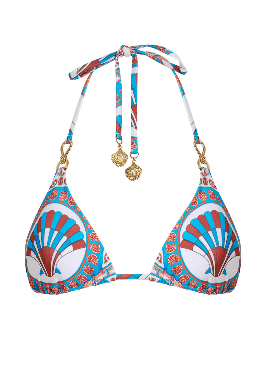 The Ceramica Lyra Top is a timeless triangle bikini top, finished with elegant gold detailing. Designed with removable padding for adjustable shape and support, it’s crafted from luxurious recycled fabric for a flattering, modern feel.