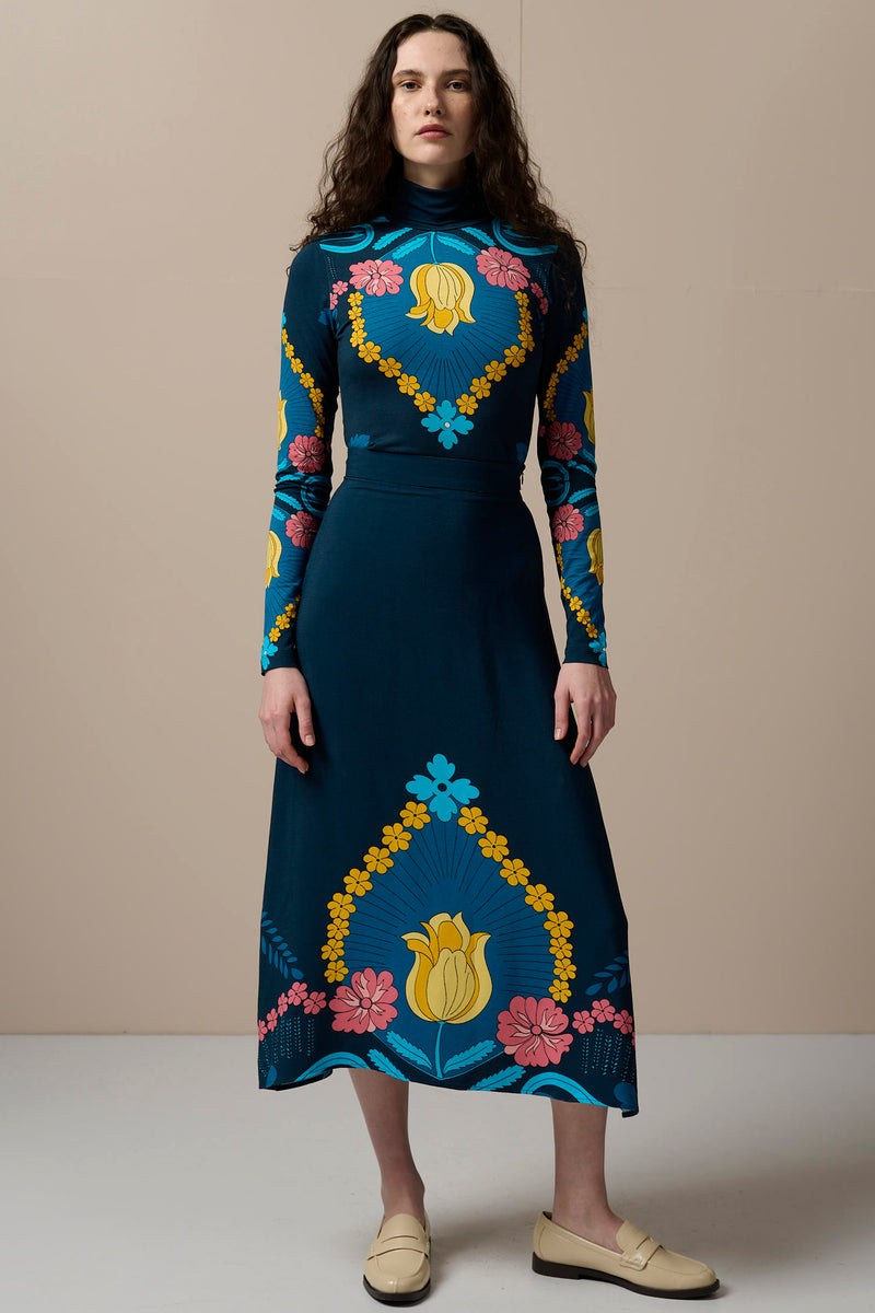 The Mine skirt features a flattering midi A-line silhouette with a side zip, offering a blend of effortless style and comfort.
