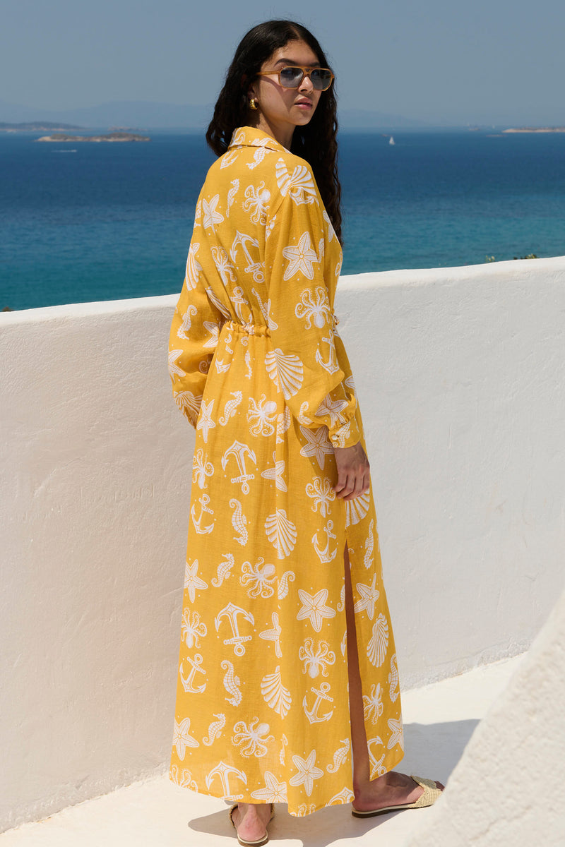 The Elios Adriana dress is a maxi shirt dress crafted from a linen–cotton blend, combining the cool texture of linen with the softness of cotton. The print is hand-drawn in London, and the dress fastens with custom Spanish buttons for a considered, artisanal finish. A drawstring tie allows the waist to be cinched in for a more defined silhouette.