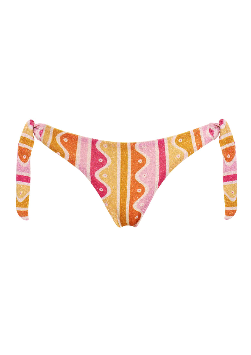 A luxury printed bikini bottom in Paolita’s exclusive Maiolica print, hand-drawn by founder Anna Paola and inspired by the hand-painted ceramics of Sicily. Fuchsia, saffron and blush in vertical stripes animated by wavy lines and dotted detail. The Semira is cut from sustainable recycled metallic fabric with a subtle all-over shimmer and adjustable tie sides. Size up for more coverage, size down for less. A designer printed bikini bottom made to mix and match across the Maiolica collection.