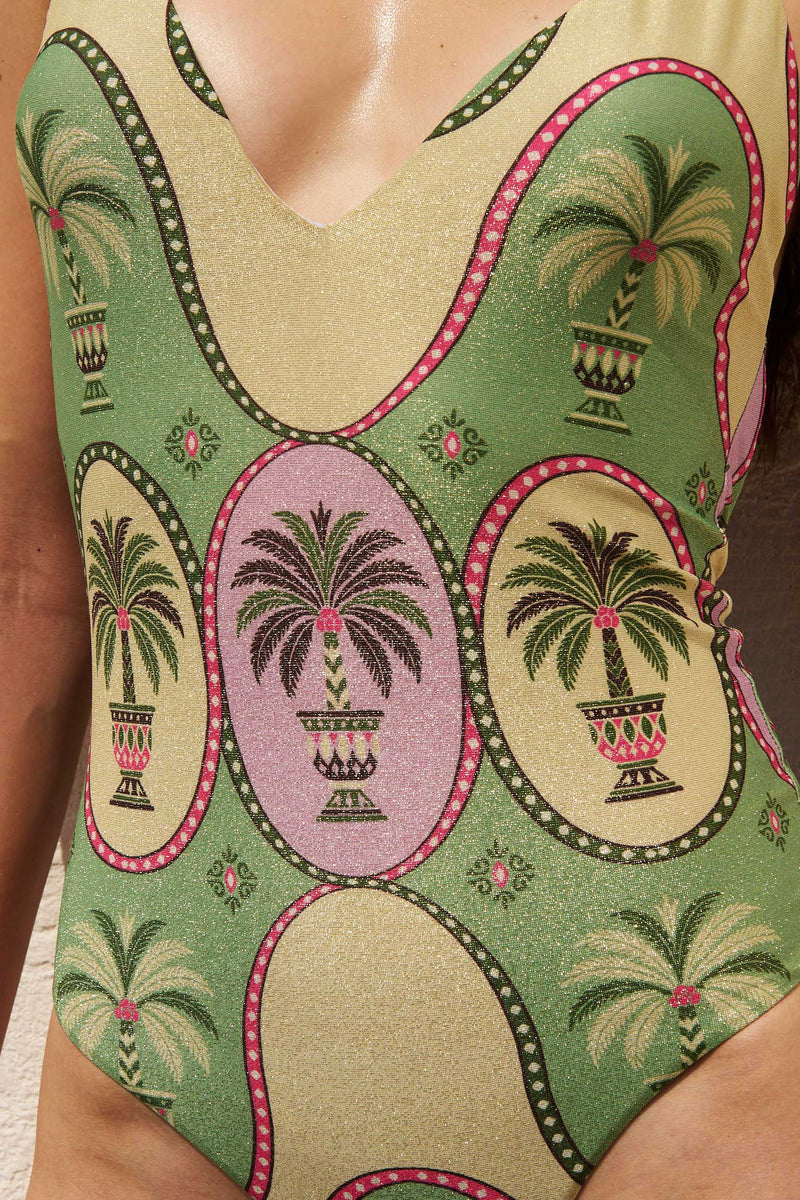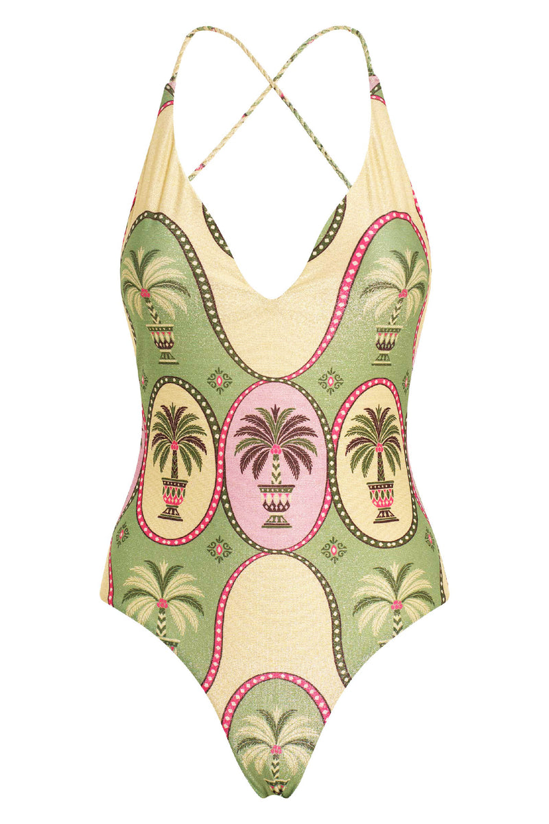 The Palma Azania one-piece is a beautifully cut swimsuit and one of our most-loved silhouettes. Designed with hand-twisted straps at the back that adjust at the centre, it offers both shape and flexibility. Crafted from fabric made with recycled fibres, the print is hand-drawn in our studio and printed in Spain. Subtle lurex woven through the fabric catches the light beautifully under the sun.