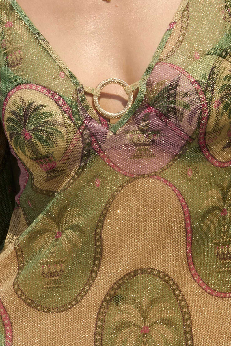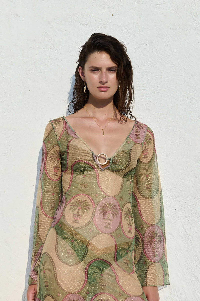 The Palma Loren dress is a long, maxi swim cover-up crafted from lightweight mesh with a subtle metallic finish. Designed with a beautiful ring detail at the décolletage, it’s a fresh yet glamorous piece that moves effortlessly and makes a statement in the sun.