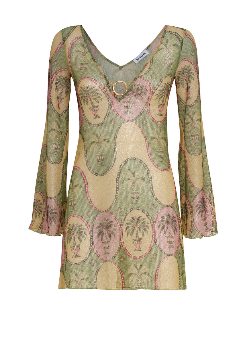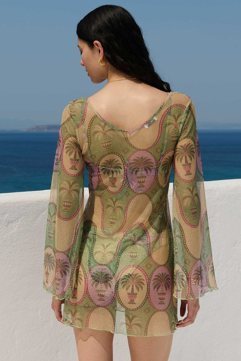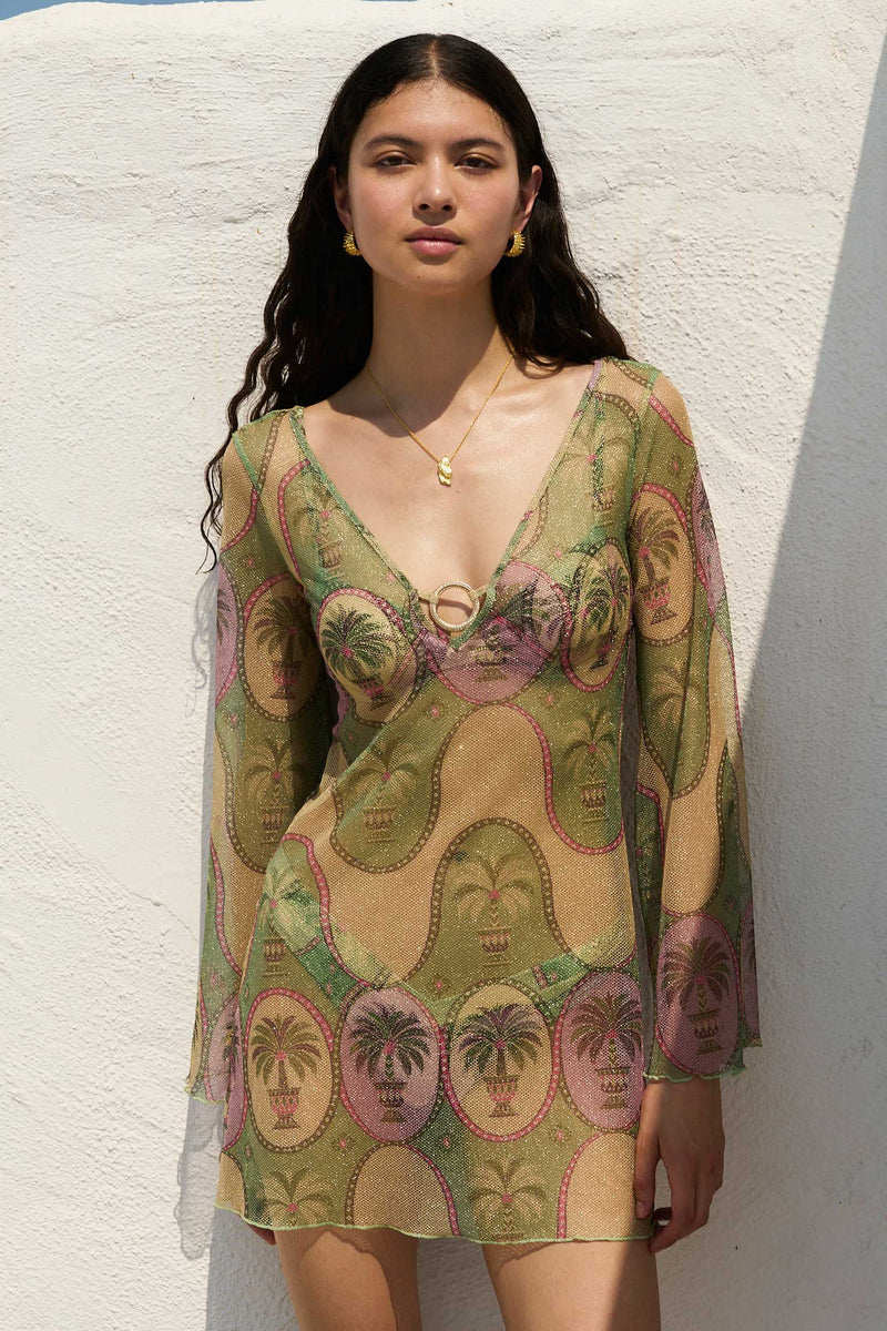 The Palma Marina dress is a short, playful swim cover-up crafted from lightweight mesh with a subtle metallic finish. Easy to slip on and effortlessly flattering, it’s designed to add a hint of shimmer and movement to warm, sun-filled days.