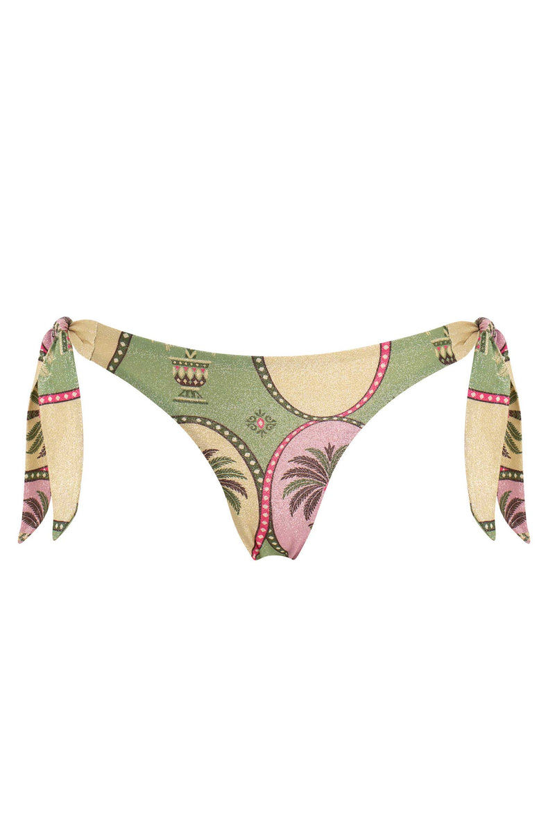 The Palma Semira bottom is a classic tie-side bikini style with soft adjustable ties at the hips. Designed to offer a standard to moderate coverage fit - size up for a little more coverage or size down for a more minimal look. Crafted from a beautiful Italian fabric with subtle lurex woven throughout, it catches the light effortlessly under the sun.