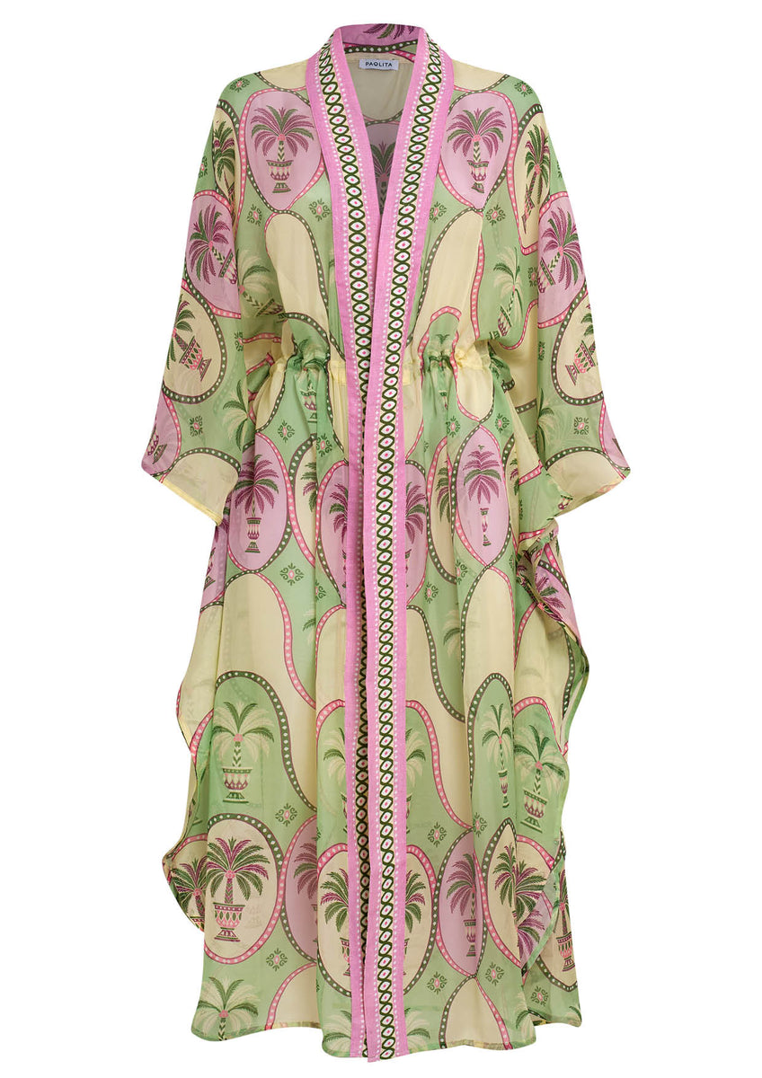 The Palma Tamara Kimono is a lightweight kimono intended to be worn open over swimwear. The silk fabric is sheer and flowing which gives it a luxurious, airy, and translucent quality. It has a maxi length and wide, loose, flowing sleeves and a relaxed, straight silhouette. It is an ideal piece for wearing over swimwear at a pool or beach, or for a casual, stylish layer in warm weather.