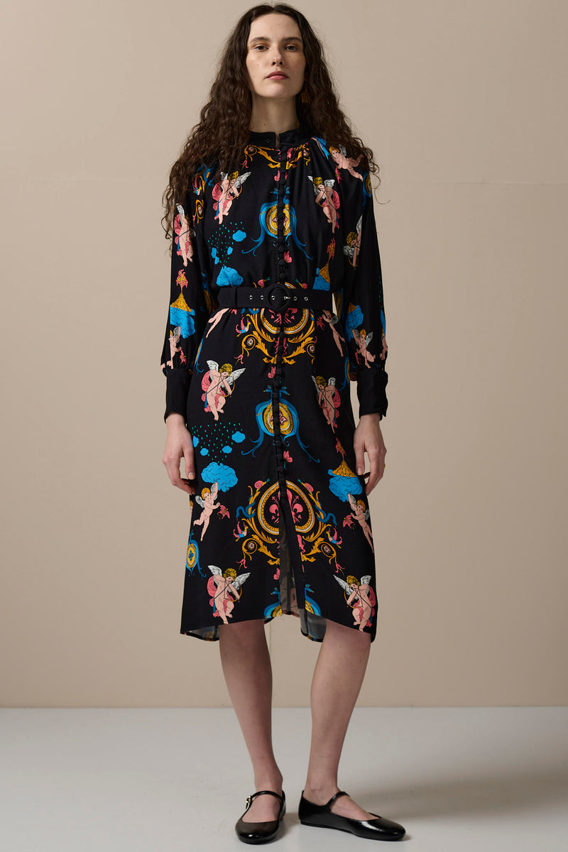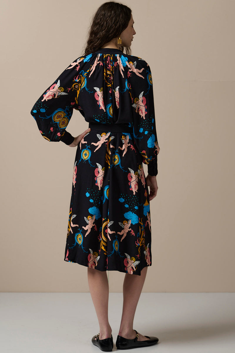 The Emilia Dress is a chic midi dress featuring elegant raglan sleeves and a gathered neckline. Crafted from draped heavy viscose, it offers a luxurious feel and versatile style.
