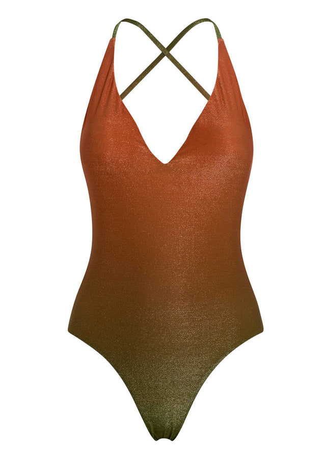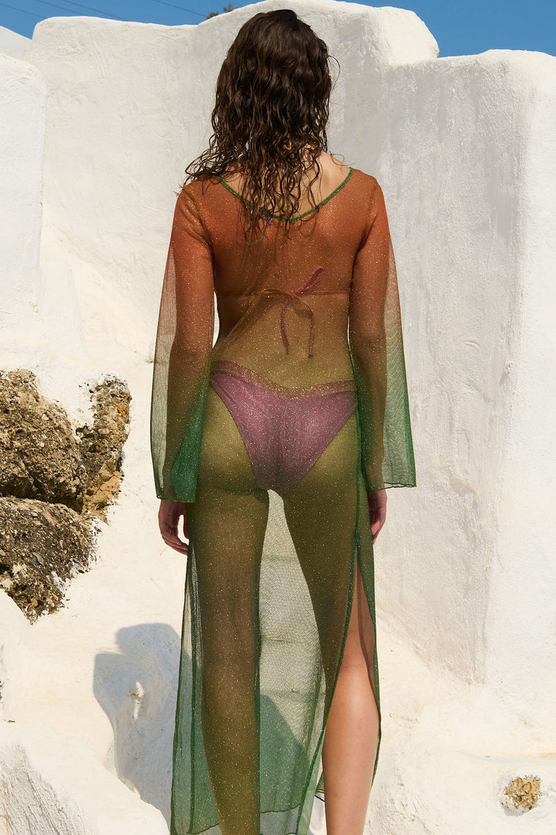 The Loren dress is a long, maxi swim cover-up crafted from lightweight mesh with a subtle metallic finish. Designed with a beautiful ring detail at the décolletage, it’s a fresh yet glamorous piece that moves effortlessly and makes a statement in the sun.