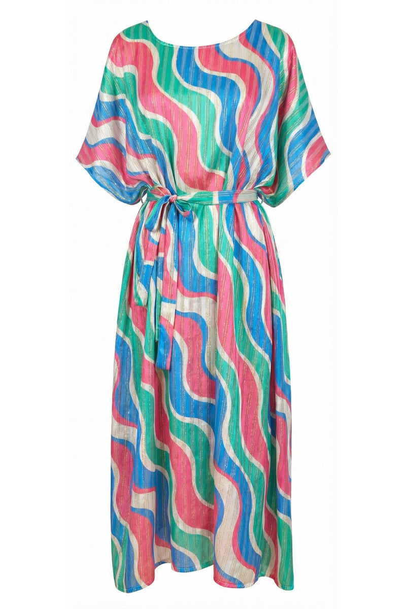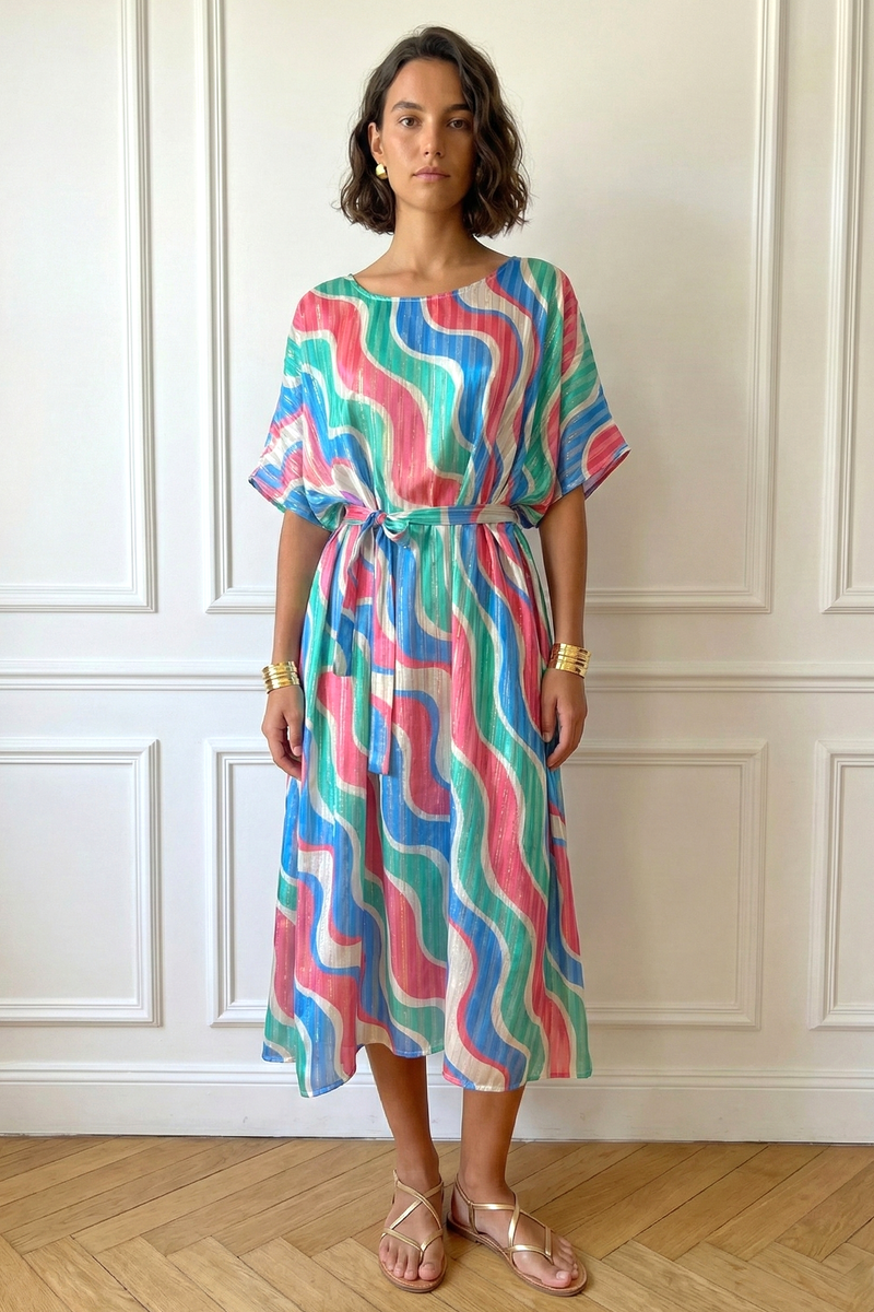 Crafted from a decadent blend of silk and gold lurex, the fabric catches the light with every movement, creating a shimmering, liquid effect. Cut to a graceful mid-calf length, this dress offers ultimate versatility. Wear it loose to let the vertical stripes elongate and flow, or cinch the waist with the matching belt for a defined, feminine silhouette. It is a wearable melody of color and light.