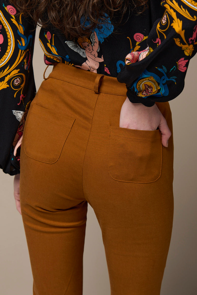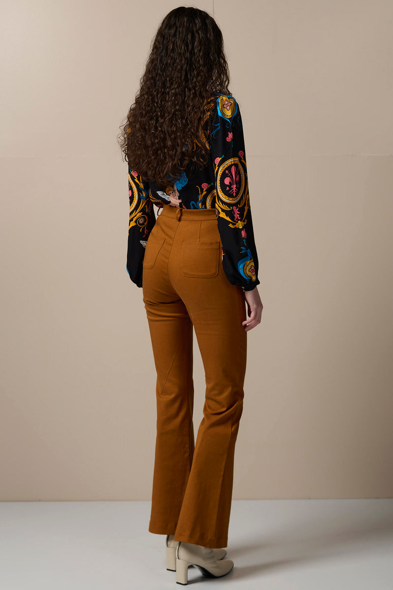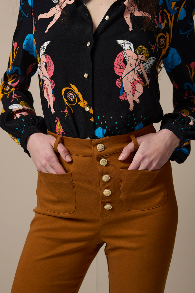 The Mia Trousers feature a flared leg and gold button detail. These trousers are the perfect day-to-night outfit when combined with one of our shirts.